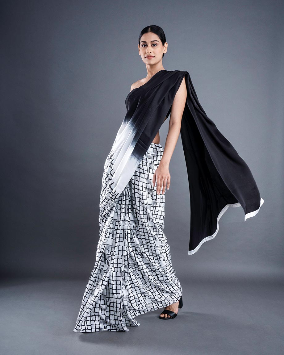 A beautiful drape set in modal satin, this saree has an ambre dyed pallu. A unique honeycomb block print is done throughout the saree. Yet another stunning piece to add to your wardrobe. If you are a saree lover, then this one will take your heart away! Pair this with any kind of blouse, each will something to remember.