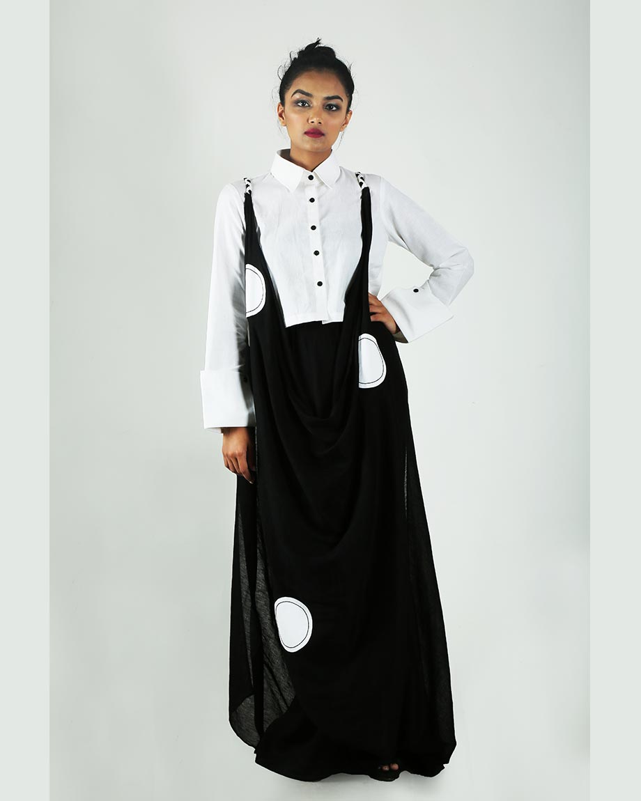 This Black Polka Sari is a stylised six yards tailored in sheery black. Neat white appliques and braided straps make it one of a kind to be styled in multiple ways. Linen is an absorbent and breathable fabric.