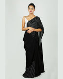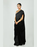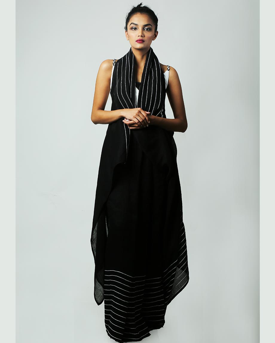 This Zipper Black Sari is a contemporarised version of the Indian wardrobe staple for every woman. Crafted in black, it is detailed with sleek lines of white thread work and lined with a zipper which makes you style in whichever way you want. Linen is an absorbent and breathable fabric.