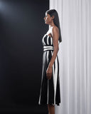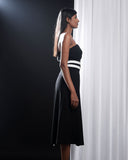 This desirable off shoulder dress crafted in black cotton fabric. Linear white, stripe like panels add the oomph, thus making the wearer look heavenly. Paired with a broad striped belt, it is detailed with white buttons.