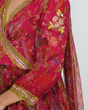 Adorned with delicate sequin work in contrasting colour the printed wrap kurta is absolute boho romance. It is paired with sequin highlighted slim dupatta and elasticated pants.