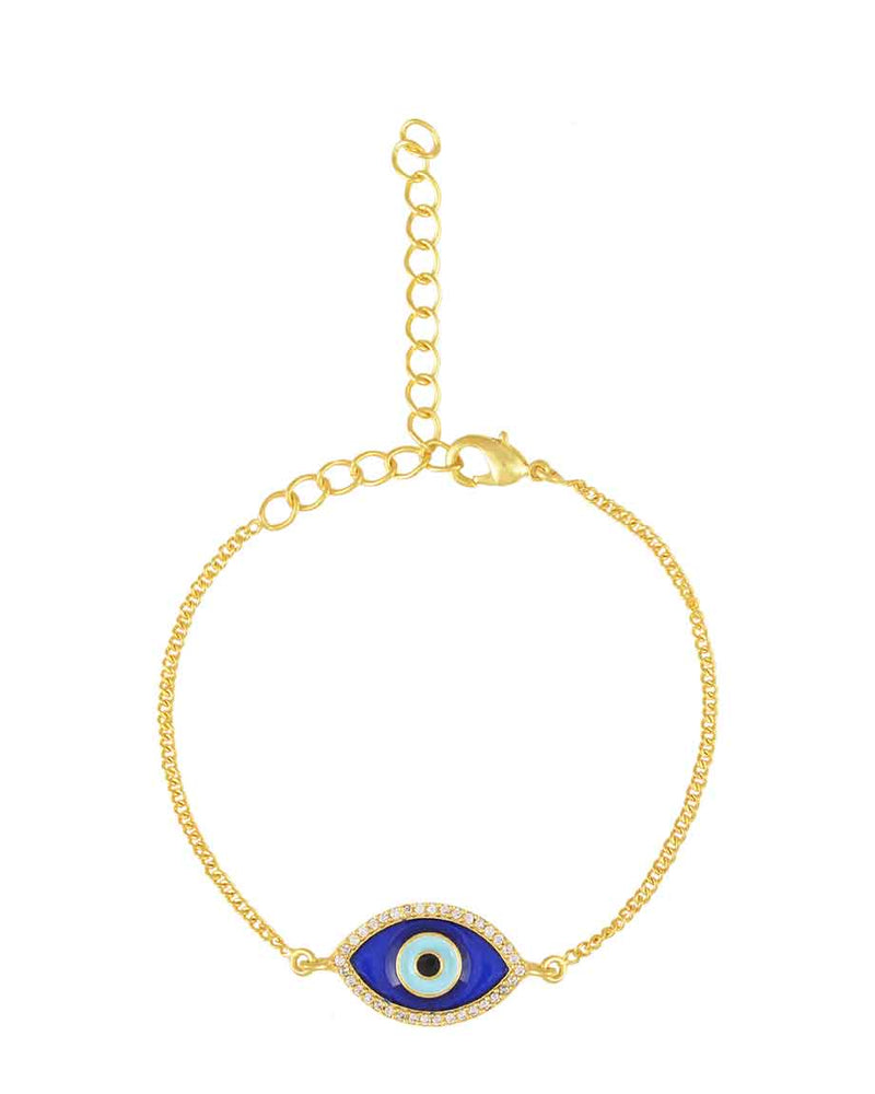 Our bracelet adorns the universal symbol and shape of an evil eye creating a modern talisman meant to ward off negativity. Inspired by Turkish mythology, the protective motif is hand enamelled with a border of american diamonds strung on an...