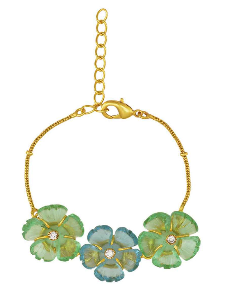 A celebration of spring, this delicate bracelet features three intrinsically carved hydro quartz flowers, accented with an american diamond. Strung on an adjustable chain making it ideal to layer with your other favourite pieces.