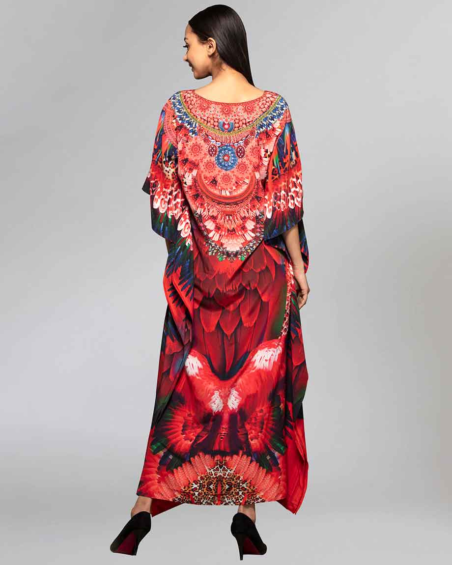 With colours so charming and style so versatile, this red and black full length kaftan in colourful tribal print can be one of your favourites. The kaftan is enhanced with a stand out crystal embellishment at neckline.