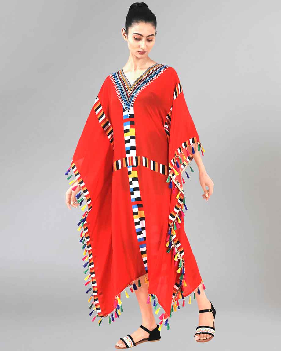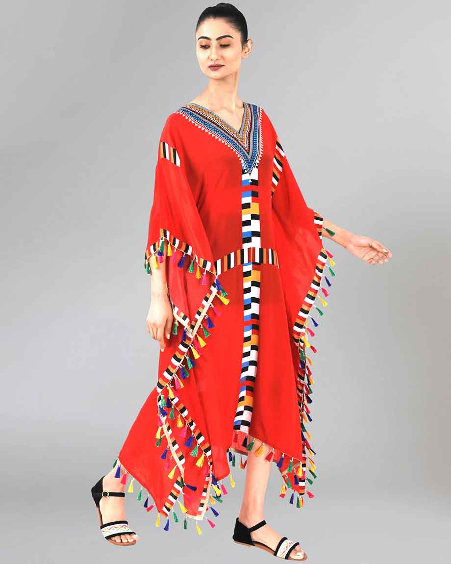 Youthful and oh-so-stylish geometric mid length kaftan can be one of your favorites. It is enhanced with multicolour tassel lace all around the hem.