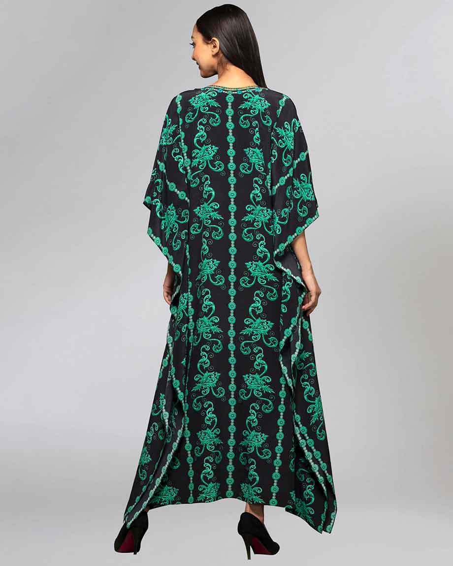 A combination of black and green classic print is always a hit! Add this black and green silk full length kaftan to your wardrobe. It is enhanced with crystal embellishment for a stunning look.