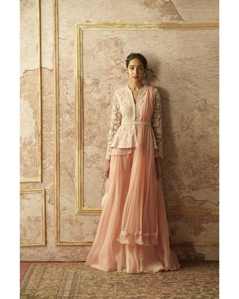 Peach net embroidered peplum and organza sharara paired with net embroidered dupatta and embroidered belt