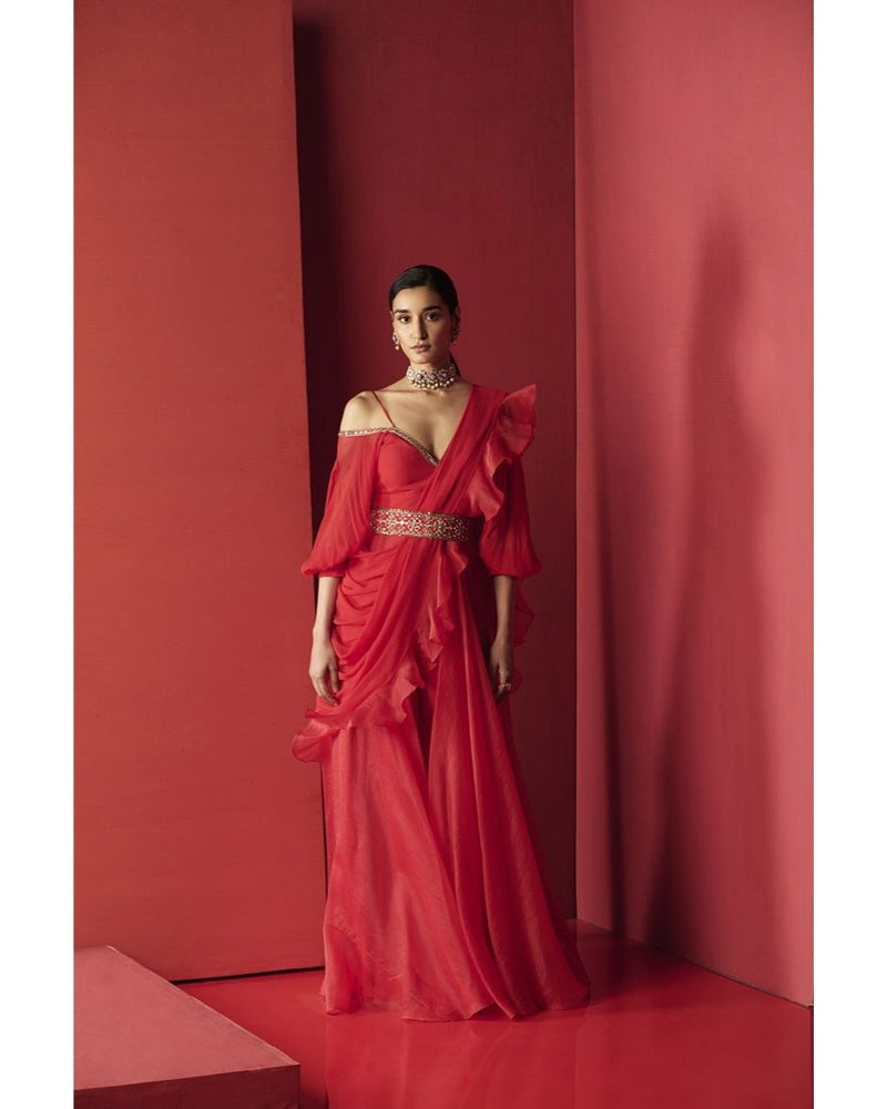 Red chiffon-organza jumpsuit and dupatta paired with embroidered belt