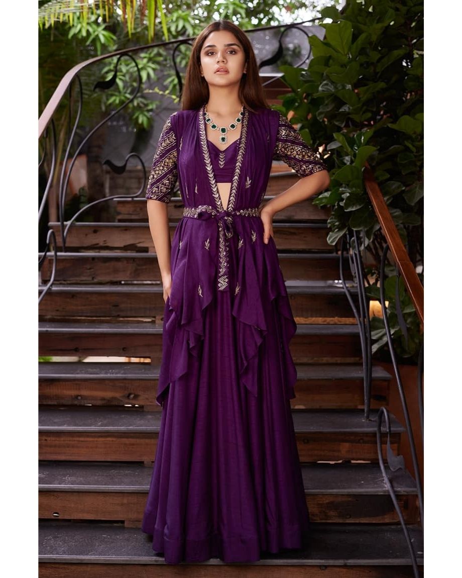 purple warp geometric sleeves short jacket with purple crop top, skirt and embroidered belt