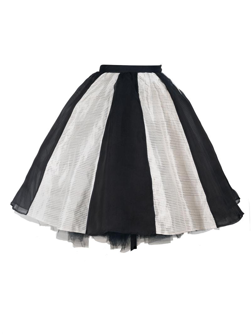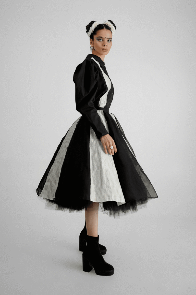 A black and silver handwoven Chanderi silk plus silk organza panelled skirt, with layers of soft tulle underneath.